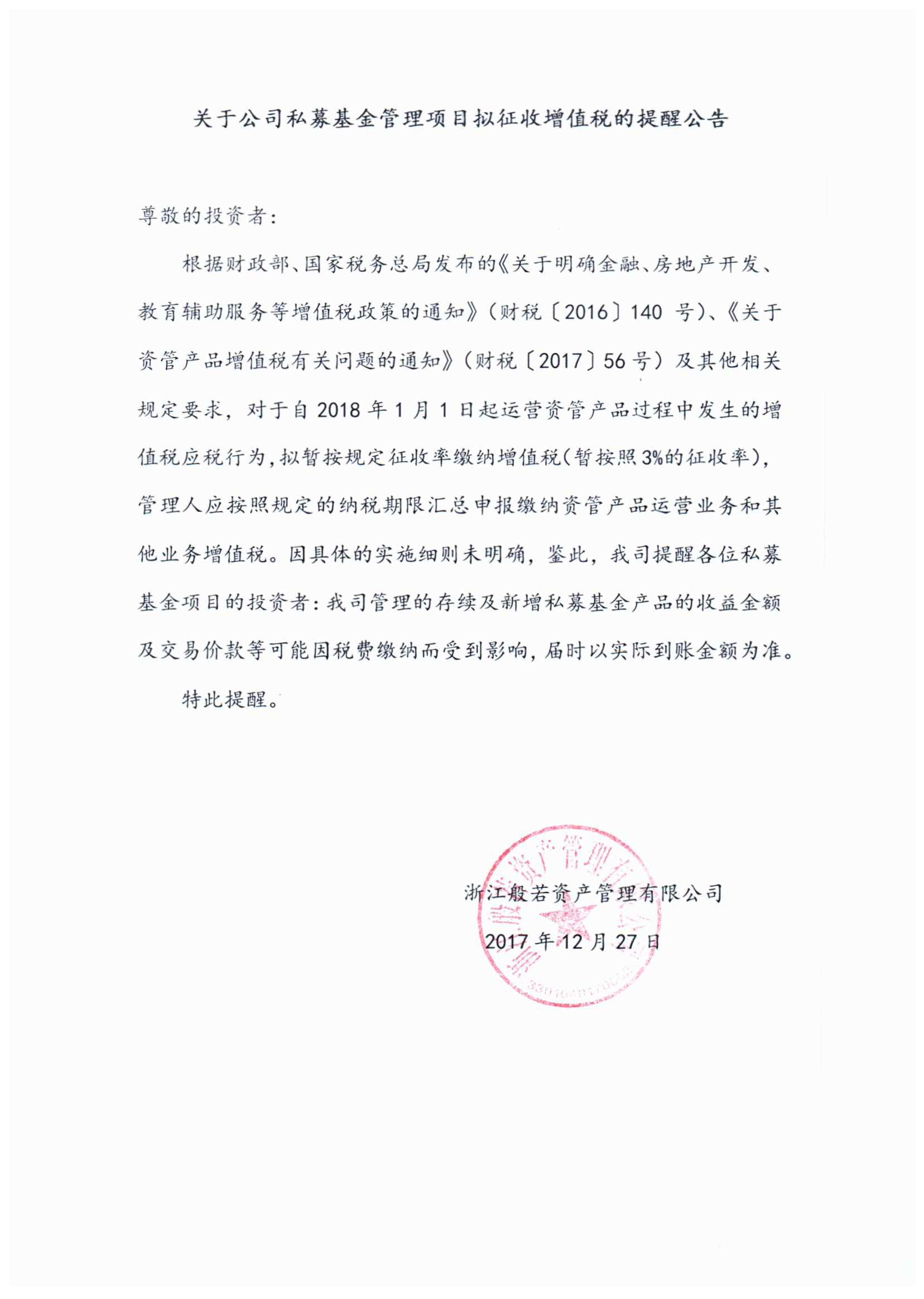 關于公司私募基金(jīn)管理(lǐ)項目拟征收增值稅的(de)提醒公告